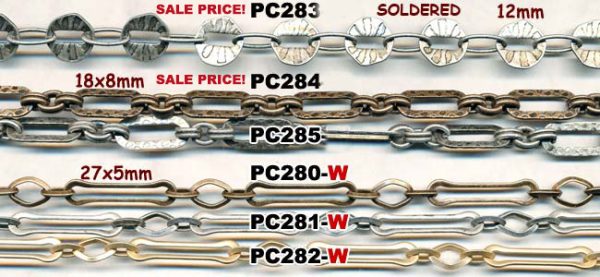 | Select Product | PC280 – $9.00 per foot chains – 27x5mm – bronze, PC280-W – $54.00 per foot (12 ft. minimum) chains – 27x5mm – bronze, PC281 – $9.00 per foot chains – 27x5mm – silver, PC281-W – $54.00per foot (12 ft. minimum) chains – 27x5mm – silver, PC282 – $9.00 per foot chains – 27x5mm – gold, PC282-W – $54.00 per foot (12 ft. minimum) chains – 27x5mm – gold |